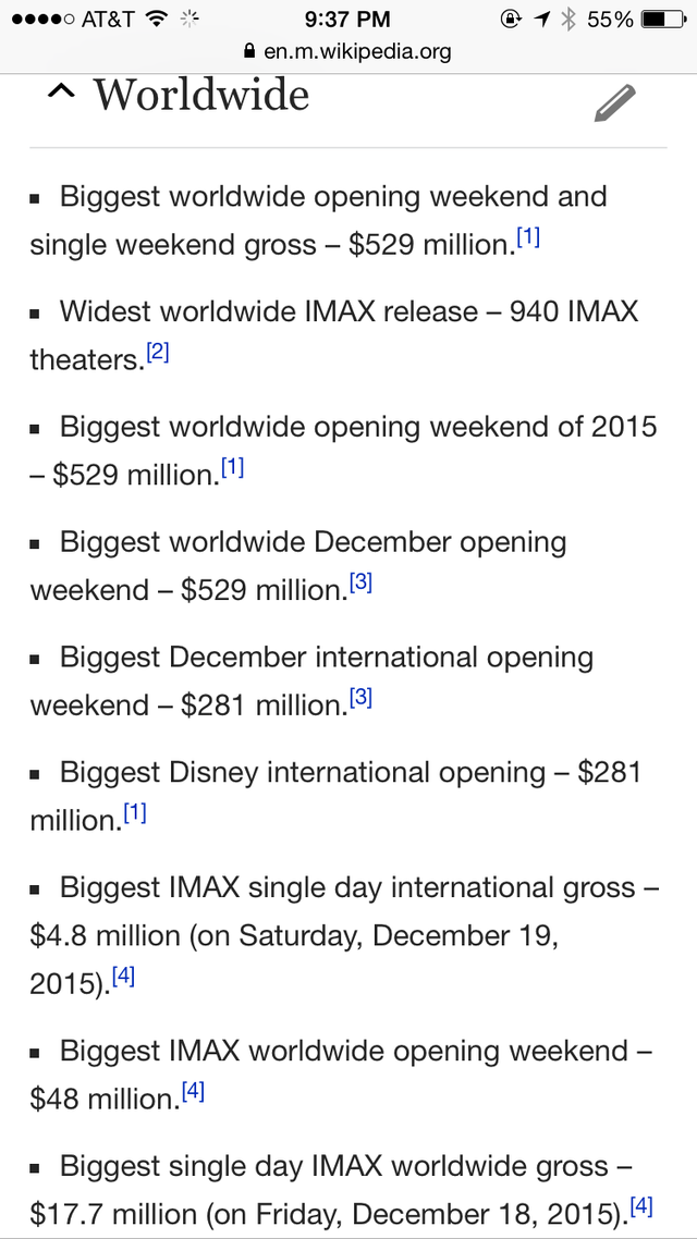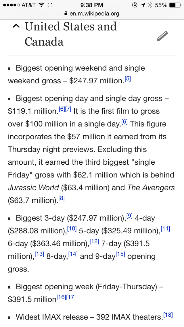 截圖只占該詞條的五分之一都不到哦,這齊刷刷的一片 Biggest/ Widest 真是氣壯山河??!預(yù)計(jì)到本周末《星戰(zhàn)7》將在北美拿下5億票房,比前任紀(jì)錄保持者《侏羅紀(jì)世界》快了近整整一倍之多!”票房記錄粉碎機(jī)“之稱果然名副其實(shí)!