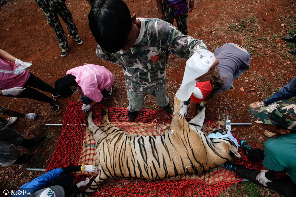 30日,泰國警方和野生動物保護(hù)部門的官員在這所佛寺里展開行動,將所有存活的老虎轉(zhuǎn)移至別處安置。湯姆·泰勒來自野生動物之友基金會,他在現(xiàn)場親眼目睹了老虎幼崽尸體被發(fā)現(xiàn)的一幕。據(jù)泰勒稱,冷凍庫里還有其他動物的尸體,而執(zhí)法人員在佛寺里一共找到了137只活老虎,其中40只已被沒收。