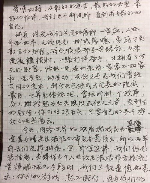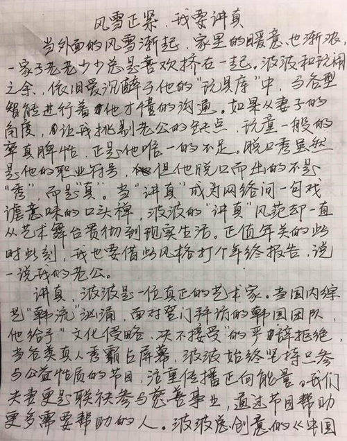 網(wǎng)易娛樂1月26日?qǐng)?bào)道 日前,演員周立波在美國(guó)長(zhǎng)島因涉嫌持有槍支、藏有毒品而被美國(guó)警方逮捕,在繳納保釋金后獲得保釋。此前周立波先是在美國(guó)通過(guò)媒體表示“持有的槍支合法,毒品并非其所有。之后還曾發(fā)微博自證“事實(shí)和法律將還我清白”。而就在1月26日早上,周立波妻子胡潔通過(guò)微博發(fā)布自己的一封手寫信,力贊丈夫周立波“完美”。對(duì)于近日的是非,她更表示“請(qǐng)不要過(guò)早下結(jié)論,先操心自己的生活”。