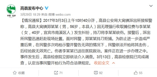 2017年3月3日上午10時40分許,高縣公安局大窩鎮(zhèn)派出所接報警稱,高縣大窩鎮(zhèn)鄭某某(男,56歲,本縣人)因無理強行收取攤位費與李某某(女,40歲,宜賓市南溪區(qū)人)發(fā)生糾紛,持刀將李某某砍傷。