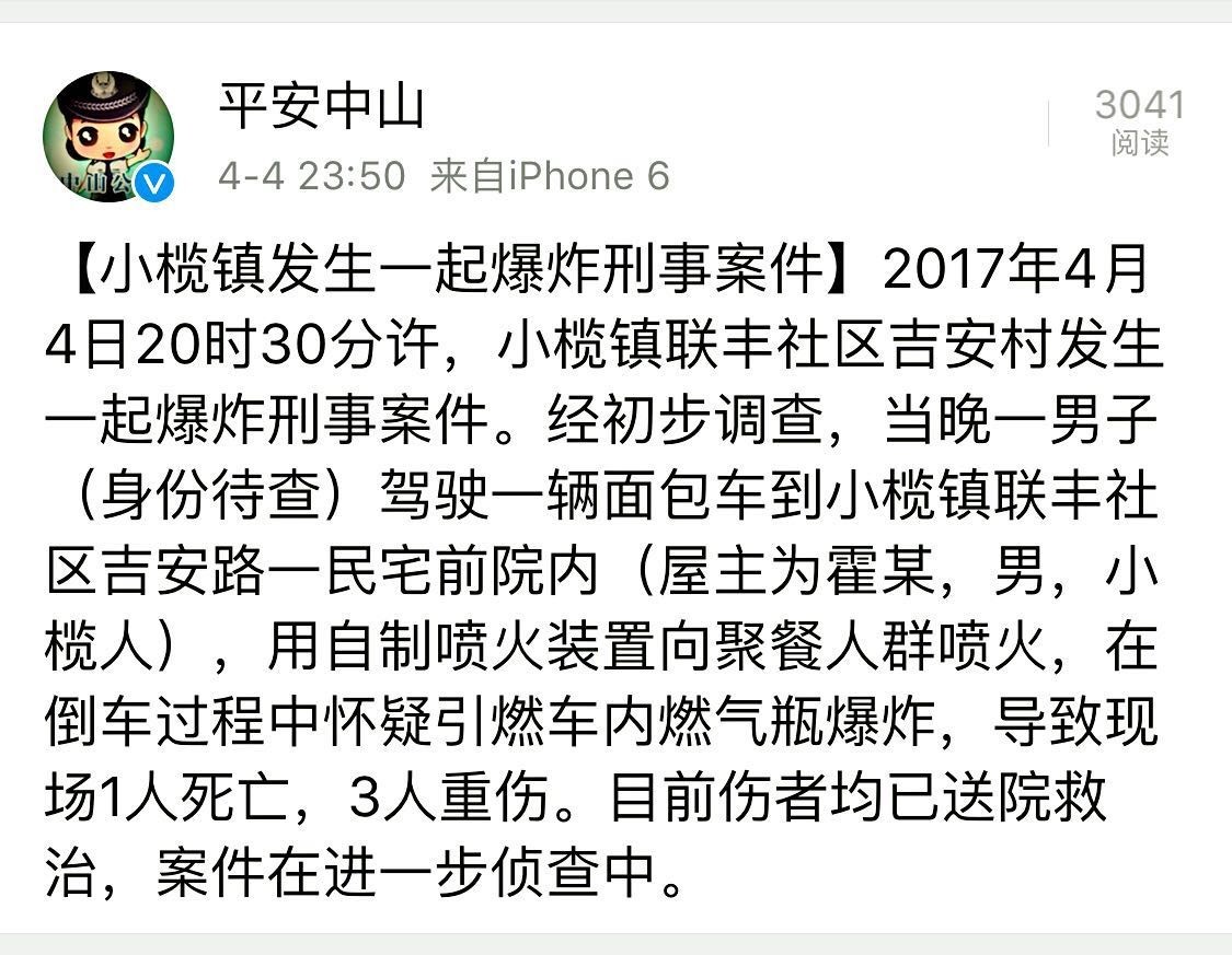 2017年4月4日20時(shí)30分許,小欖鎮(zhèn)聯(lián)豐社區(qū)吉安村發(fā)生一起爆炸刑事案件。經(jīng)初步調(diào)查,當(dāng)晚一男子(身份待查)駕駛一輛面包車(chē)到小欖鎮(zhèn)聯(lián)豐社區(qū)吉安路一民宅前院內(nèi)(屋主為霍某,男,小欖人),用自制噴火裝置向聚餐人群噴火,在倒車(chē)過(guò)程中懷疑引燃車(chē)內(nèi)燃?xì)馄勘?,?dǎo)致現(xiàn)場(chǎng)1人死亡,3人重傷。目前傷者均已送院救治,案件在進(jìn)一步偵查中。