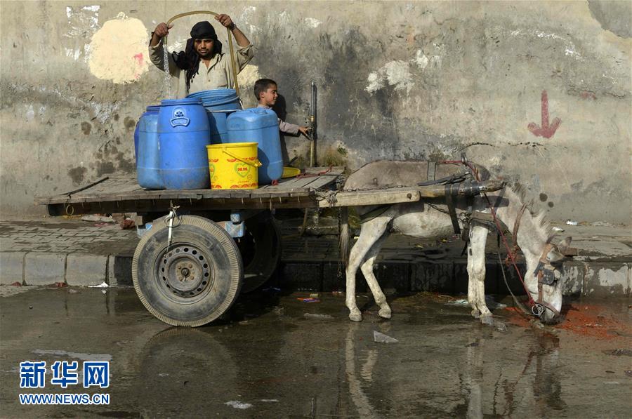 4月19日,在巴基斯坦拉合爾,一名男子從路邊的水龍頭里取水。 巴基斯坦受高溫侵襲,許多地區(qū)氣溫超過45攝氏度。