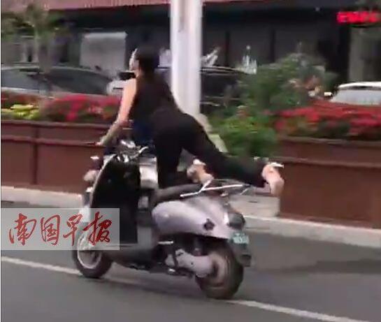 4月24日,有網友在微博上發(fā)布一段視頻:一女車手騎電驢的方式有些奇葩,車輛行駛過程中,女子突然往后伸出大長腿,擺出“飛行”姿勢一路前行。”  還有網友調侃說,“沒想到你是這樣深藏不露的大長腿”,認為該女子的駕車行為頗為奇葩。