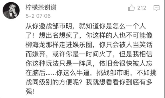 先是向奧運冠軍鄒市明下戰(zhàn)書,就引來很多網(wǎng)友的不滿,被指炒作。