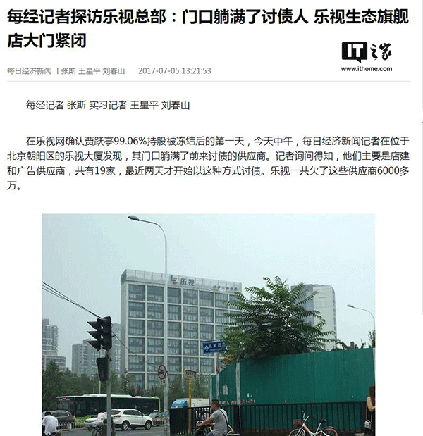 樂視最近可謂麻煩不斷,在確認賈躍亭99.06%持股被凍結后,據(jù)每日經(jīng)濟新聞報道,位于北京朝陽區(qū)的樂視大廈門口躺滿了前來討債的供應商。