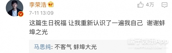 隨后李榮浩就在底下評論說馬思純的這篇生日祝福讓他重新認識了自己,還稱她為“蚌埠之光”。而馬思純也回復他說“不客氣,蚌埠大光?!?/p>