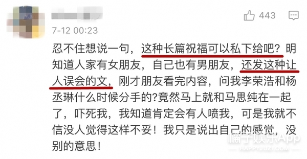 然而,評論的畫風走向有點讓人意外。不少網(wǎng)友認為馬思純有歐豪了,李榮浩也有楊丞琳了,這種長文祝福信不應該公開發(fā)↓