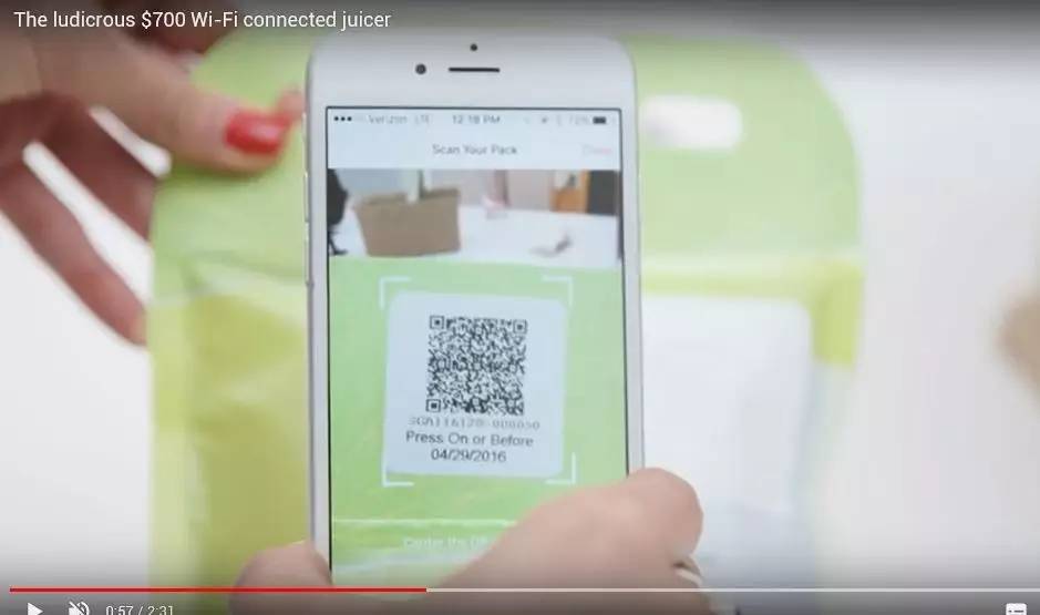 此外,這些主打互聯(lián)網(wǎng)概念的“果汁材料包”還有二維碼可供掃描。用戶掃碼之后,手機上可顯示出材料包內(nèi)商品的生產(chǎn)信息。并且聯(lián)網(wǎng)后的智能榨汁機還可以讀取這些信息。如果有變質(zhì)、過期的不新鮮材料包被投入機器,榨汁機將拒絕工作。