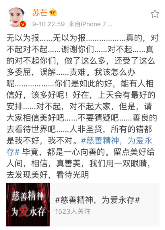蘇芒微博全文:無以為報(bào),無以為報(bào)……真的,對(duì)不起對(duì)不起,謝謝你們,對(duì)不起,真的對(duì)不起你們,做了那么多,還受這么多委屈、誤解、責(zé)難。我該怎么辦呢……你們是如此的好,能有人相信好,該有多好呢!好在上天會(huì)有最好的安排……對(duì)不起,對(duì)不起大家。但是請(qǐng)大家相信美好吧……不要猜疑吧……善良的去看待世界吧……人非圣賢,所有的錯(cuò)都是我不好,我不對(duì)。畢竟,都是一心向善的。留點(diǎn)美好給人間,相信,真善美,我們用一雙眼睛,去發(fā)現(xiàn)美好,看待光明。
