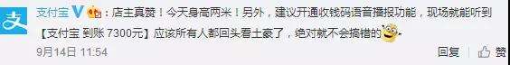 對(duì)此,支付寶官方表示,建議開(kāi)通收錢(qián)碼語(yǔ)音播報(bào)功能,現(xiàn)場(chǎng)就能聽(tīng)到“支付寶到賬7300元”,應(yīng)該所有人都回頭看土豪了,絕對(duì)就不會(huì)搞錯(cuò)的。