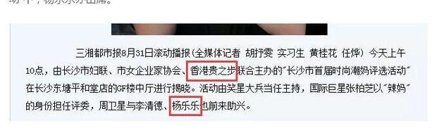 此外,另一篇來自三湘都市報(bào),題為《張柏芝當(dāng)評(píng)委現(xiàn)身長(zhǎng)沙至潮五星辣媽揭曉》的報(bào)道也提到,在長(zhǎng)沙市婦聯(lián)、市女企業(yè)家協(xié)會(huì)、香港貴之步聯(lián)合主辦的“長(zhǎng)沙市首屆時(shí)尚潮媽評(píng)選活動(dòng)”中,楊樂樂亦出席。