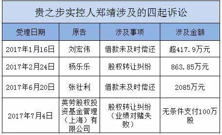 因涉及多起訴訟,鄭靖所持貴之步2347.45萬股(占公司股份總數(shù)73.39%)被多家法院凍結(jié)。