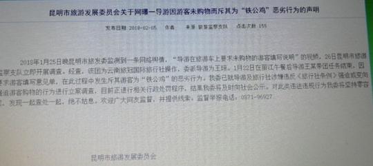 近日,網(wǎng)傳云南一導(dǎo)游斥未購(gòu)物游客為“鐵公雞”,引發(fā)關(guān)注。昆明市旅發(fā)委稱(chēng),2018年1月25日晚昆明市旅發(fā)委監(jiān)測(cè)到一條網(wǎng)絡(luò)輿情,“導(dǎo)游在旅游車(chē)上要求未購(gòu)物的游客填寫(xiě)說(shuō)明”的視頻,26日昆明市旅游監(jiān)察支隊(duì)立即開(kāi)展調(diào)查。
