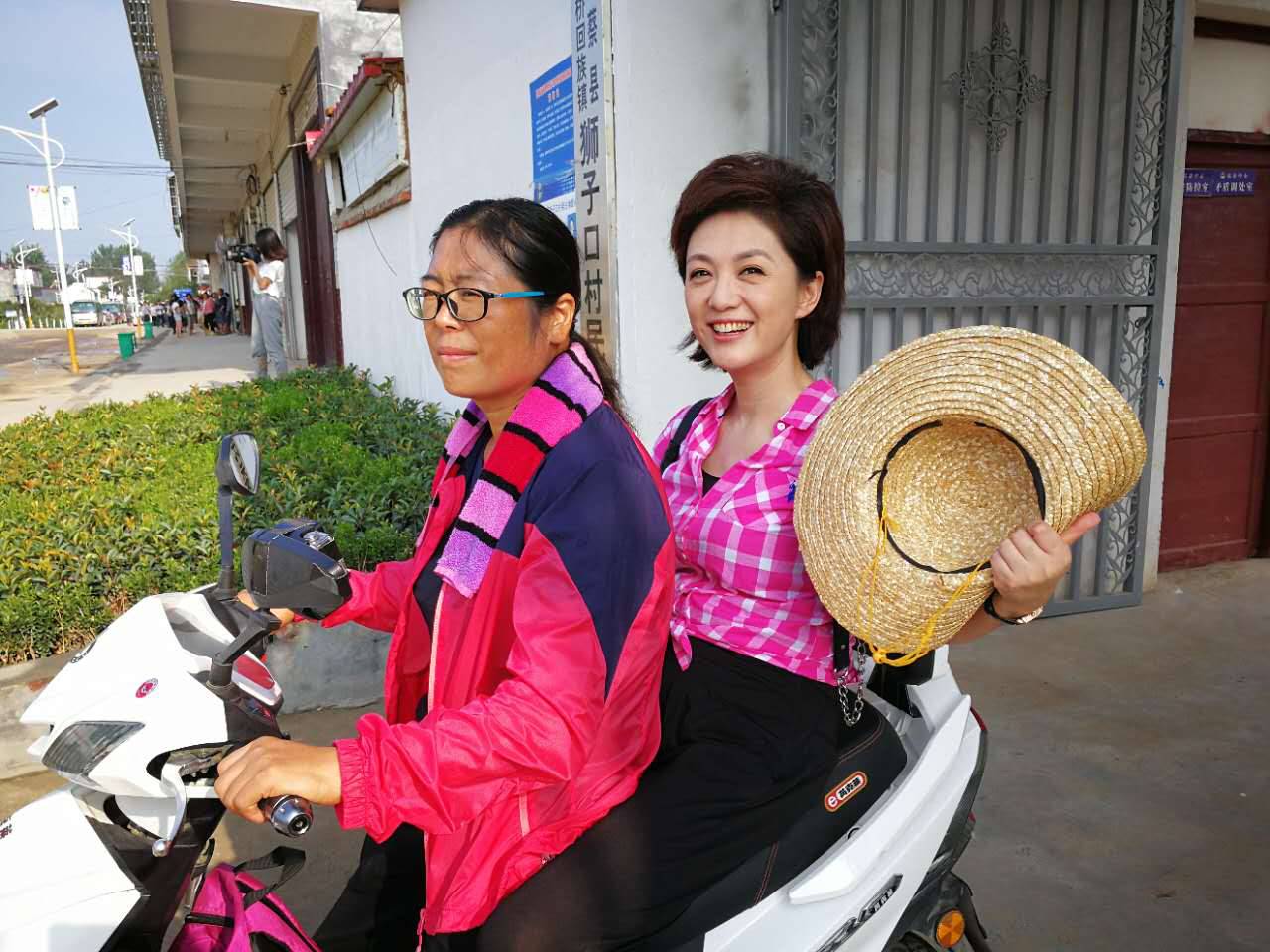 海霞和原玉榮走村串戶,都是坐著原玉榮的電動(dòng)自行車。原玉榮擔(dān)心她坐不慣,可海霞毫無怨言,感覺很開心。一路在村子里走訪,村民們看到了原書記和坐在電動(dòng)車上,頭戴草帽的海霞,紛紛向她們熱情的打招呼。