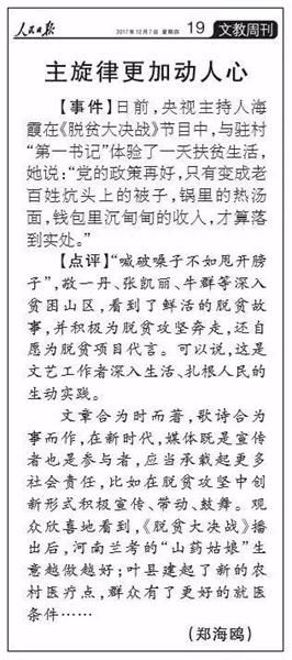 作為十九大的重要獻禮篇,《脫貧大決戰(zhàn)》第二季于10月11日正式播出。從第一季的“認識貧困、了解貧困”,到第二季的“幫扶貧困、解決貧困”,固本求新,展現(xiàn)扶貧工作的現(xiàn)實意義和顯著成效,彰顯河南在全國脫貧攻堅中的責(zé)任和擔(dān)當。節(jié)目播出之后,《光明日報》刊發(fā)《“土氣”背后的擔(dān)當精神——關(guān)于大型公益扶貧節(jié)目<脫貧大決戰(zhàn)>》。《人民日報》發(fā)表評論《主旋律更加動人心》,稱贊《脫貧大決戰(zhàn)》是“深入生活、扎根人民的生動實踐”,國務(wù)院扶貧辦、中宣部、省委省政府、省委宣傳部等多個領(lǐng)導(dǎo)對節(jié)目給予充分肯定。