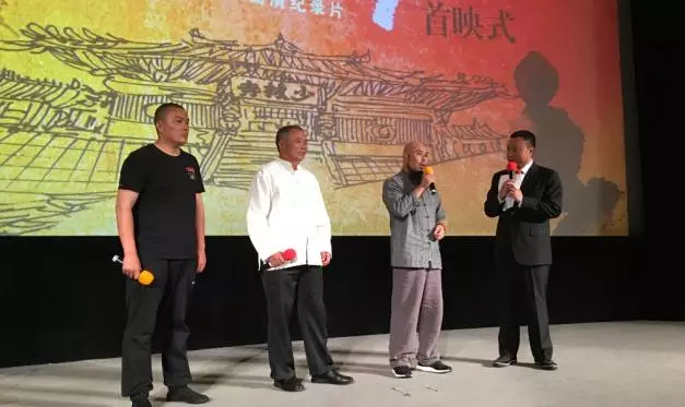 在掌聲中,河南電視臺、央視紀錄頻道的全體領導等與功夫名家們上臺共同啟動首映。