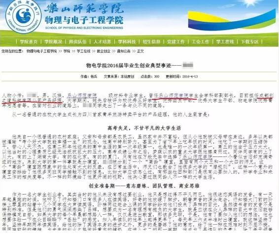 樂山師院學院官網(wǎng)上貼出的關于李飛創(chuàng)業(yè)的典型事跡