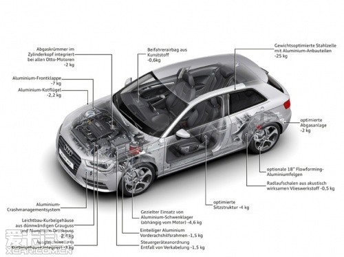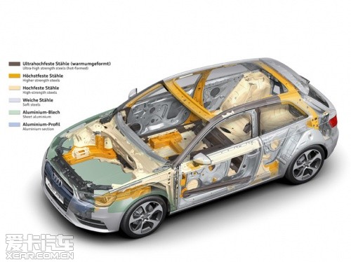 “輕量化”之于奧迪,已然成為品牌精髓所在,截止2011年已有70萬輛裝備了AFS輕質(zhì)車架的奧迪汽車駛下生產(chǎn)線。全新一代奧迪A3相比老款的減重達到了80千克,首當(dāng)其沖的就是采用了復(fù)合材料車架,車架型材包括了奧迪擁有自主知識產(chǎn)權(quán)的:超硬鋼、先進高強度鋼、高強度鋼、低碳鋼以及鋁板。這些不同材料通過多種連接方式構(gòu)成了強度大幅提升的車身,同時重量下降了18千克。而大眾集團最新的“MQB”橫置發(fā)動機模塊化平臺則能夠幫助奧迪A3進一步減輕重量,比如A3使用的前輪鋁制副車架就帶來了6千克的減重效果。