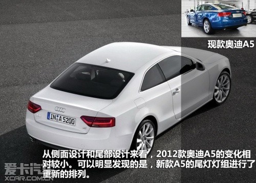 從側(cè)面設(shè)計和尾部設(shè)計來看,2012款奧迪A5的變化相對較小??梢悦黠@發(fā)現(xiàn)的是,新款A(yù)5的尾燈燈組進行了重新的排列,側(cè)身腰線及裙邊依舊維持著經(jīng)典的設(shè)計。其它方面,新的17英寸輪轂將成為新款A(yù)5的標(biāo)配,另外還可選裝20英寸輪轂。