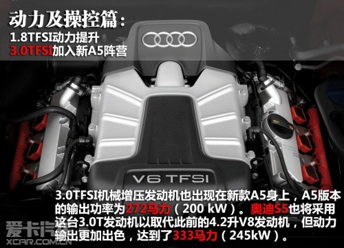 入門級的奧迪A5將采用1.8TFSI發(fā)動機,重新調(diào)教后,動力輸出從158馬力提高到168馬力。2.0 TFSI發(fā)動機的動力輸出依舊為211馬力(155kW)。3.0TFSI機械增壓發(fā)動機也出現(xiàn)在新款A(yù)5身上,A5版本的輸出功率為272馬力(200 kW)。奧迪S5也將采用這臺3.0T發(fā)動機以取代此前的4.2升V8發(fā)動機,但動力輸出更加出色,達(dá)到了333馬力(245kW)。變速箱方面,與以上幾款發(fā)動機匹配的將有6速手動、無級變速器、7速S tronic三種。
