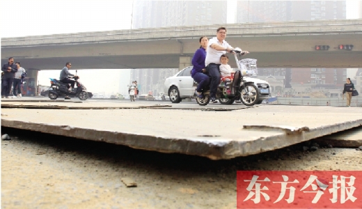 路人說:鐵板本來就比路面滑,再加上附近一直施工,經(jīng)常會有細(xì)土或砂石落在上面,就更加光滑,電動車、自行車和行人走在上面,不小心的話很容易滑倒。如果再碰到鐵板的棱角,后果就不堪設(shè)想。