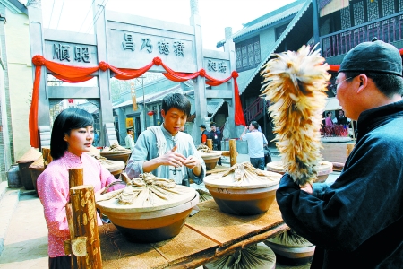 儀式在《大河兒女》專用外景拍攝基地“三河鎮(zhèn)”大戲樓前舉行。三河鎮(zhèn)的三條主街兩側(cè)的店鋪已經(jīng)全部開業(yè),紅綢高懸、人聲鼎沸,穿著長衫馬褂的店小二熱情地招呼著來往的客人,戲樓上的演員正唱得投入,此情此景,讓人恍如穿越到了民國。