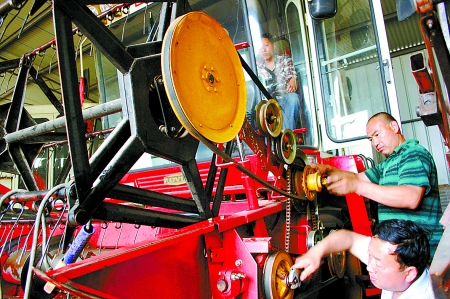 5月7日,武陟縣農(nóng)機局的技術(shù)人員正在幫助農(nóng)機手檢修小麥?zhǔn)崭顧C。“三夏”臨近,武陟縣農(nóng)機局組織技術(shù)人員深入鄉(xiāng)村,對全縣參加跨區(qū)作業(yè)的800多臺小麥聯(lián)合收割機進行全面檢修,并對機手進行安全操作技能培訓(xùn),做好參加跨區(qū)麥?zhǔn)铡皶?zhàn)”的準(zhǔn)備。 馮小敏 李福利 攝