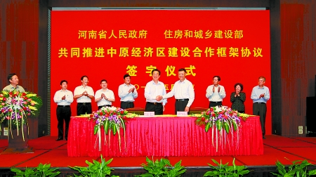 5月10日下午,河南省人民政府與住房和城鄉(xiāng)建設部在北京簽署《共同推進中原經(jīng)濟區(qū)建設合作框架協(xié)議》,省委副書記、省長郭庚茂,住房和城鄉(xiāng)建設部部長姜偉新出席簽字儀式,并代表雙方簽署協(xié)議。