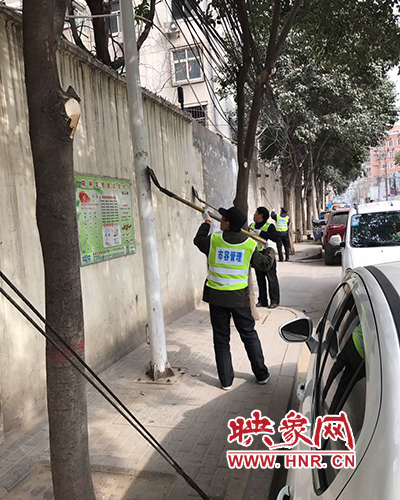 工作人員把丟在地上的廣告紙,拾起扔進準備好的垃圾袋;欄桿墻面上“頑固的小廣告”,先灑上水潤濕,然后用小鏟逐一耐心鏟掉;對路面的灰塵、生活垃圾建筑垃圾等進行現(xiàn)場打掃,集中清運;對散亂的纜線進行整理固定,對裸露的黃土覆蓋上防塵網(wǎng),工作場面甚是壯觀。經(jīng)過3個小時的辛苦勞動,共清理垃圾5余車。