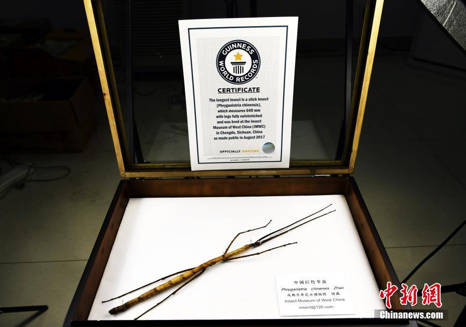 圖為中國(guó)巨竹節(jié)蟲(Phryganistria chinensis Zhao )最長(zhǎng)個(gè)體,與獲得的吉尼斯世界紀(jì)錄證書。