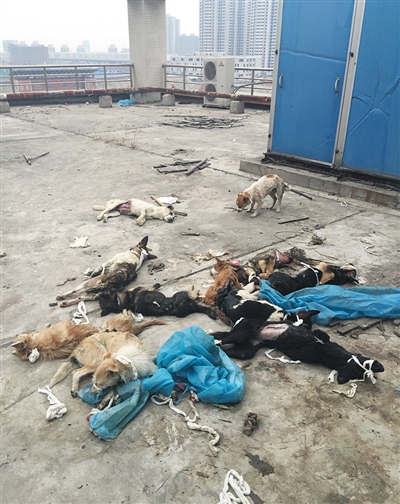 5日,西安醫(yī)學(xué)院一實(shí)驗(yàn)樓樓頂上,數(shù)十只狗身上滿是傷痕,有的疼得抽搐。愛(ài)心志愿者供圖