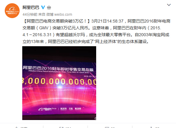 阿里巴巴3月21日宣布,截至3月21日14:58:37,阿里巴巴2016財年電商交易額(GMV)突破3萬億元人民幣。這意味著,阿里巴巴在財年內(nèi)(2015.4.1-2016.3.31)有望超越沃爾瑪,成為全球最大零售平臺。