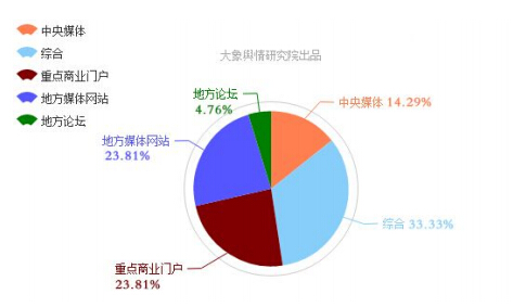 上圖可以看出,關(guān)注此事件的網(wǎng)絡(luò)媒體中,綜合類網(wǎng)站傳播活躍度最高,重點商業(yè)門戶網(wǎng)站和地方媒體網(wǎng)站旗鼓相當(dāng)、緊隨其后。