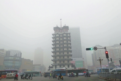 霧霾天里,鄭州二七廣場附近的建筑若隱若現(xiàn)?!∮浾甙字芊鍞z影