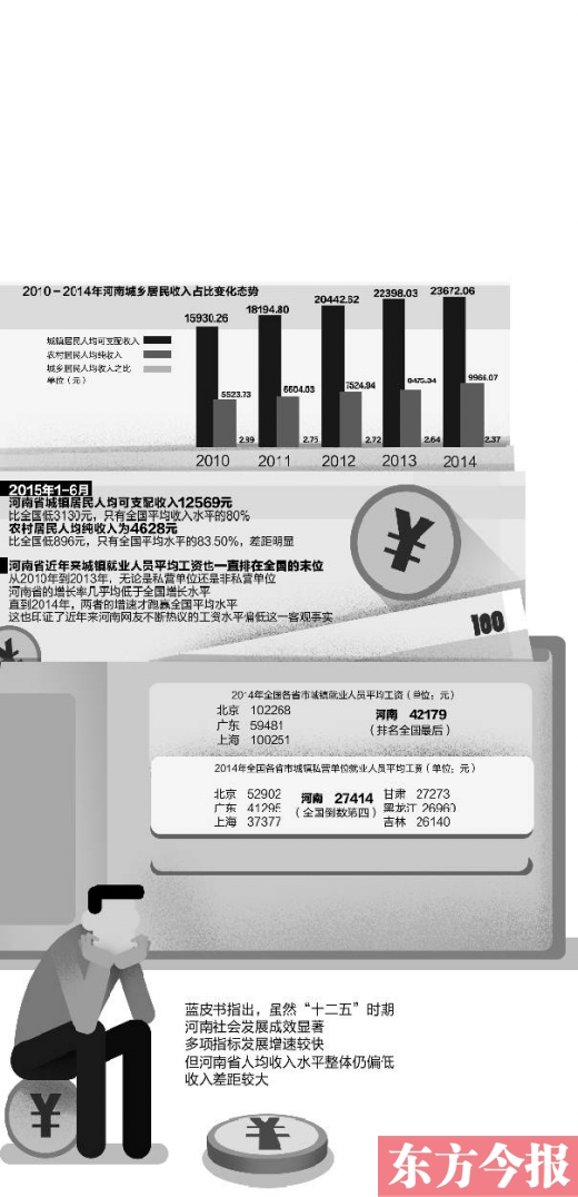 藍(lán)皮書(shū)指出,雖然“十二五”時(shí)期河南社會(huì)發(fā)展成效顯著,多項(xiàng)指標(biāo)發(fā)展增速較快,但河南省人均收入水平整體仍偏低,收入差距較大?!鯑|方今報(bào)首席記者 李凌全省經(jīng)濟(jì)發(fā)展并不平衡。豫北豫西發(fā)展較快,豫東豫南發(fā)展較慢,但是在收入分配領(lǐng)域中,全省18個(gè)省轄市之間收入水平雖然存在著不小的差距,但并不與經(jīng)濟(jì)發(fā)展同步。