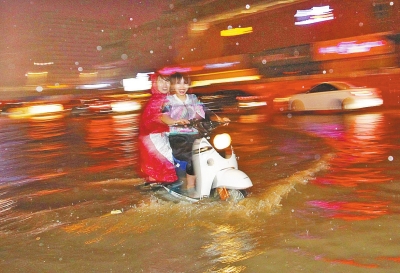 昨晚11時30分許,經(jīng)三路上兩個女孩騎著電動車走在“汪洋”中。