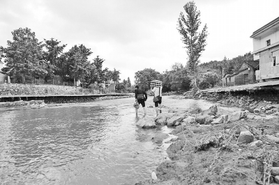新縣卡房鄉(xiāng)因橋被洪水沖斷,群眾只能涉水過(guò)河。記者何正權(quán)李鑫攝影