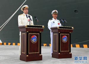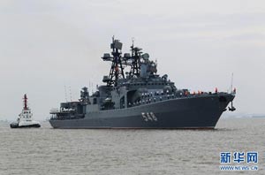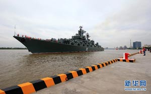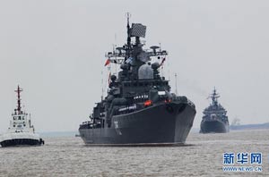 當(dāng)日,參加中俄“海上聯(lián)合—2014”軍事演習(xí)的俄方艦艇陸續(xù)駛抵上海某軍港。中俄兩國海軍互鳴禮炮,中方為來訪的俄艦舉行隆重歡迎儀式。俄羅斯太平洋艦隊(duì)旗艦“瓦良格”號導(dǎo)彈巡洋艦駛?cè)胲姼蹠r,參加歡迎儀式的軍樂隊(duì)奏響歡迎曲。隨后,“快速”號驅(qū)逐艦、“潘捷列耶夫海軍上將”號大型反潛艦、“伊利姆”號中型海洋油船、“涅維爾斯科伊海軍上將”號大型登陸艦,“卡拉爾”號海洋拖船陸續(xù)駛?cè)敫劭凇_@次聯(lián)合軍事演習(xí),中俄海軍都派出了主戰(zhàn)艦艇參加。中方參演兵力包括導(dǎo)彈驅(qū)逐艦、導(dǎo)彈護(hù)衛(wèi)艦、綜合補(bǔ)給艦以及導(dǎo)彈艇等水面艦艇8艘、潛艇2艘、固定翼飛機(jī)9架。俄方參演兵力包括巡洋艦、反潛艦、驅(qū)逐艦、登陸艦、油船和海洋拖船等水面艦艇6艘。此外,為執(zhí)行海上聯(lián)合解救被劫持船只、護(hù)航等特殊任務(wù),雙方還派出艦載直升機(jī)、特戰(zhàn)分隊(duì)等兵力參加此次演習(xí)。新華社記者 查春明攝
