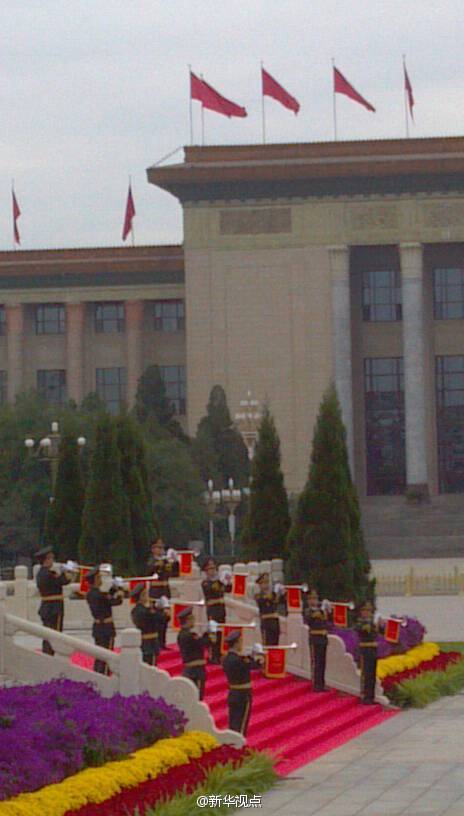 新華網(wǎng)北京9月30日電 據(jù)新華社“新華視點”微博報道,今天是國家設(shè)立的首個烈士紀(jì)念日,正值新中國成立65周年之際。上午,習(xí)近平、李克強、張德江、俞正聲、劉云山、王岐山、張高麗等來到天安門廣場,與首都各界代表一起,出席向人民英雄敬獻花籃儀式。