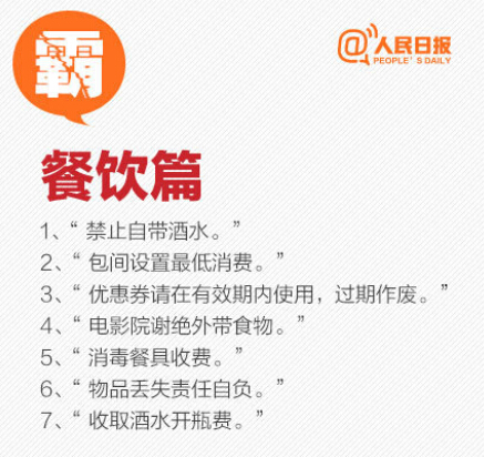 消協(xié)指出,影院禁帶食品屬霸王條款。“餐廳禁止自帶酒水”“包間最低消費(fèi)xx元”“一經(jīng)售出,概不退換”“本方擁有最終解釋權(quán)”“物品丟失本店概不負(fù)責(zé)”……熟悉吧?都是霸王條款!如果遇到,果斷打12315投訴,再不忍氣吞聲!為自己擴(kuò)散