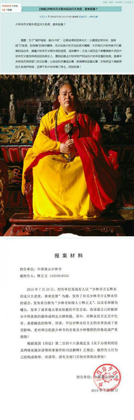 近日,一位自稱(chēng)“少林寺知情人士釋正義”的人在網(wǎng)上發(fā)布“少林寺方丈釋永信這只大老虎,誰(shuí)來(lái)監(jiān)督”的帖子,對(duì)此,中國(guó)嵩山少林寺官方網(wǎng)站發(fā)布報(bào)案材料,要求“有關(guān)部門(mén)盡快對(duì)造謠者依法進(jìn)行查處”。