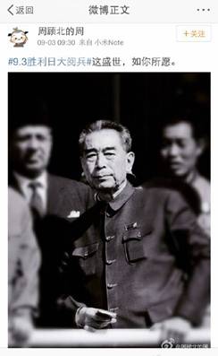 讓人難忘的細(xì)節(jié)不僅僅在閱兵場上。3日上午9時30分,習(xí)近平主席偕夫人彭麗媛正在天安門迎候各國嘉賓,閱兵尚未正式開始,會場內(nèi)外興奮期待的氛圍漸濃。就在此時,網(wǎng)友“周顧北的周”發(fā)布了一條微博“這盛世,如你所愿”,配圖是一張周恩來總理的老照片。短短的七字微博引發(fā)了網(wǎng)友的強(qiáng)烈共鳴,轉(zhuǎn)發(fā)已過百萬。“開國大典的時候飛機(jī)不夠,周總理說飛兩遍,現(xiàn)在再也不需要飛兩遍了,要多少有多少。山河猶在,國泰民安。當(dāng)年送你的十里長安街,如今已是十里繁榮。”