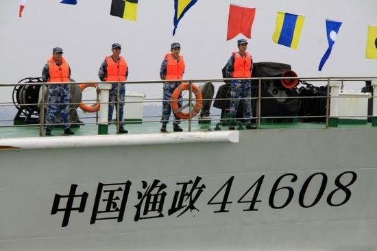 資料圖片:2013年3月30日,赴黃巖島護(hù)漁執(zhí)法中國(guó)漁政44608船駛?cè)肷穷^海灣。當(dāng)日上午,中國(guó)漁政44608船歷時(shí)23天、順利完成黃巖島護(hù)漁執(zhí)法巡航任務(wù)返回廣東汕頭港。新華社發(fā)(姚軍 攝)