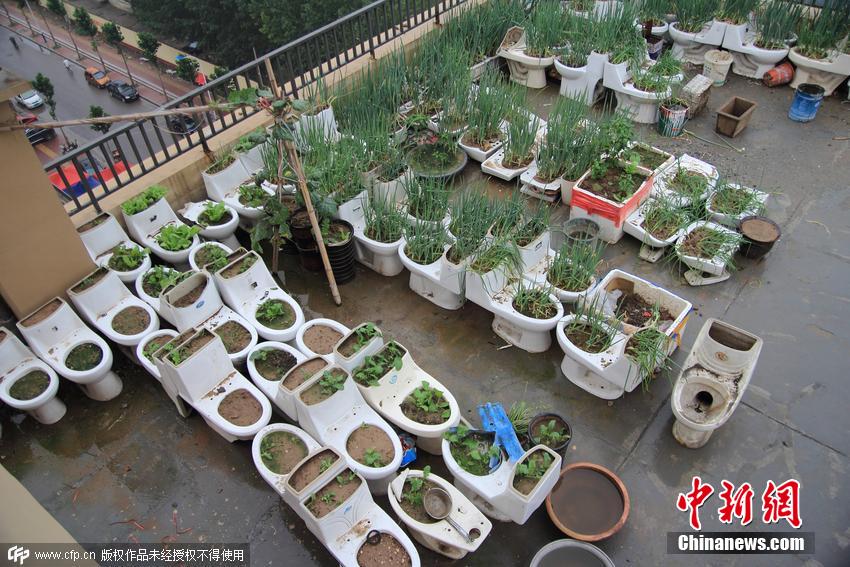 2015年07月16日,山東省菏澤市,在中央公館小區(qū)21號樓樓頂?shù)南榔脚_上,有業(yè)主擺放了數(shù)十個廢棄馬桶,種上了各種蔬菜。還用廢舊沙發(fā)搭起了鴨棚,養(yǎng)起了鴨子。在樓頂?shù)慕锹淅铮浾哌€發(fā)現(xiàn)了一個簡易廁所。該樓居民表示,“菜園”的主人平時就直接使用廁所糞便作為蔬菜的肥料。天氣炎熱時,氣味很大,附近居民苦不堪言。