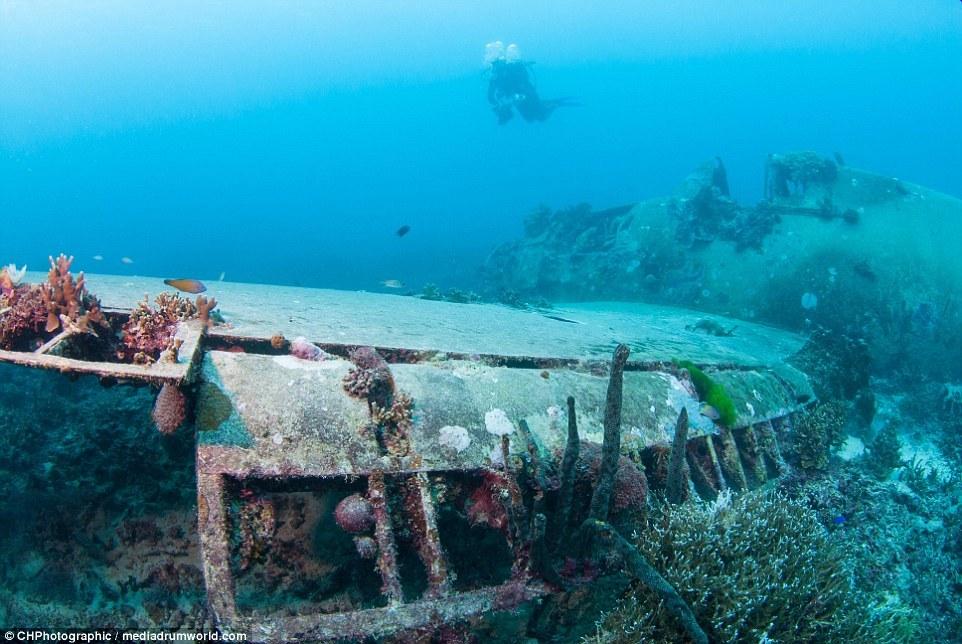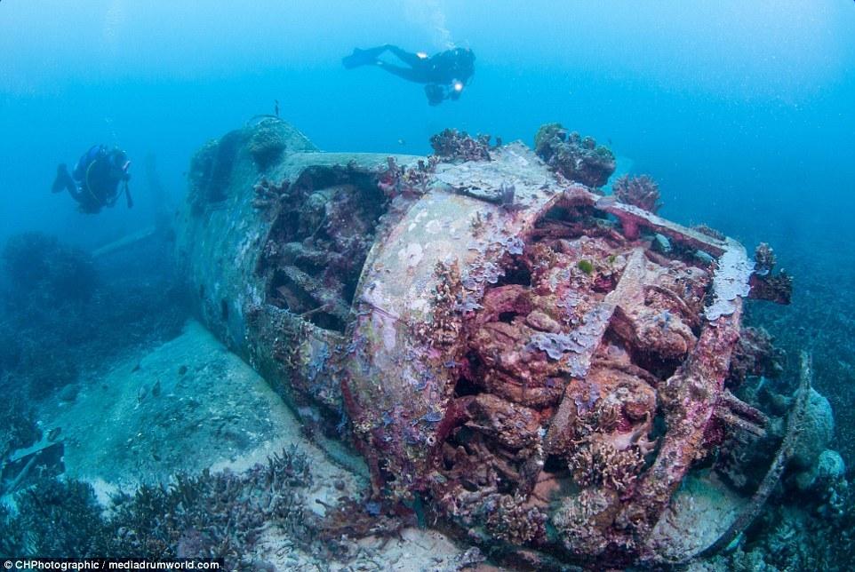 這些曾經(jīng)參與世界大戰(zhàn)的戰(zhàn)斗機(jī)如今安靜的躺在所羅門群島大海185英尺(約56米)的淺層海床上。今夕形成了鮮明的對(duì)比,英勇的美國F6F地獄貓戰(zhàn)斗機(jī)上覆蓋了大量的珊瑚。