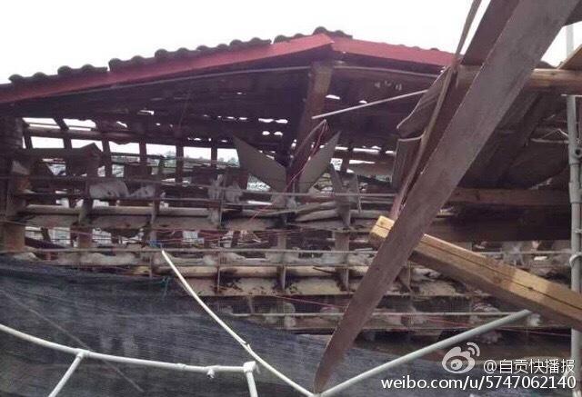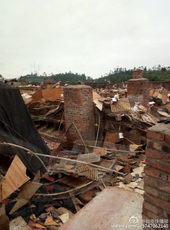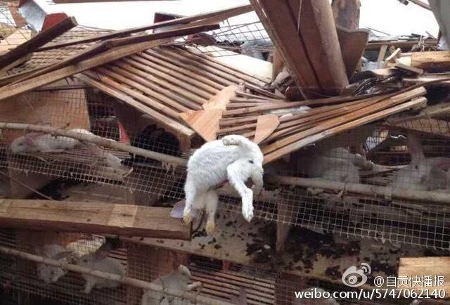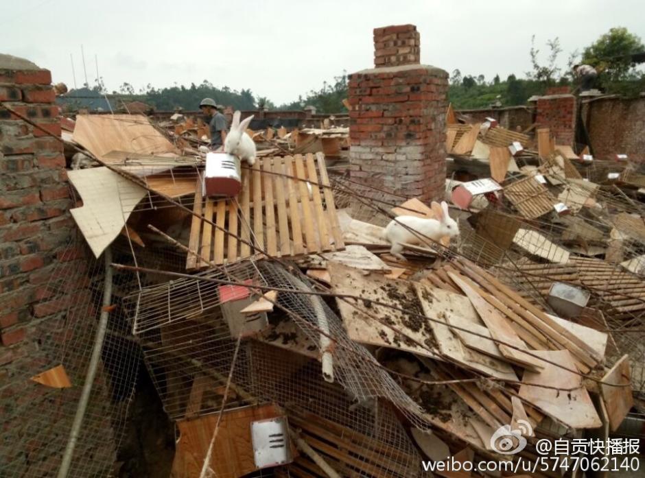 7月12日凌晨5時許,陣性大風(fēng)突襲四川自貢榮縣古文鎮(zhèn),風(fēng)災(zāi)使古文鎮(zhèn)山邊村鄉(xiāng)巴佬養(yǎng)殖基地6000平米兔舍垮塌,事發(fā)時,該兔舍共有26000只兔子。記者在現(xiàn)場看到,兔舍頂棚已經(jīng)被完全吹跨,木制橫梁和隔板隨處散落,部分兔舍仍有大量兔子被埋,10余名工人正在清理現(xiàn)場和搶救活兔。據(jù)兔舍負(fù)責(zé)人介紹,經(jīng)過近30多小時生產(chǎn)自救已搶救出5000余只活兔,初步估計有10000余只兔子死亡,直接損失超過300萬元。(記者 曹實(shí)秋)圖片來源:華西都市報自貢城市頻道官方微博