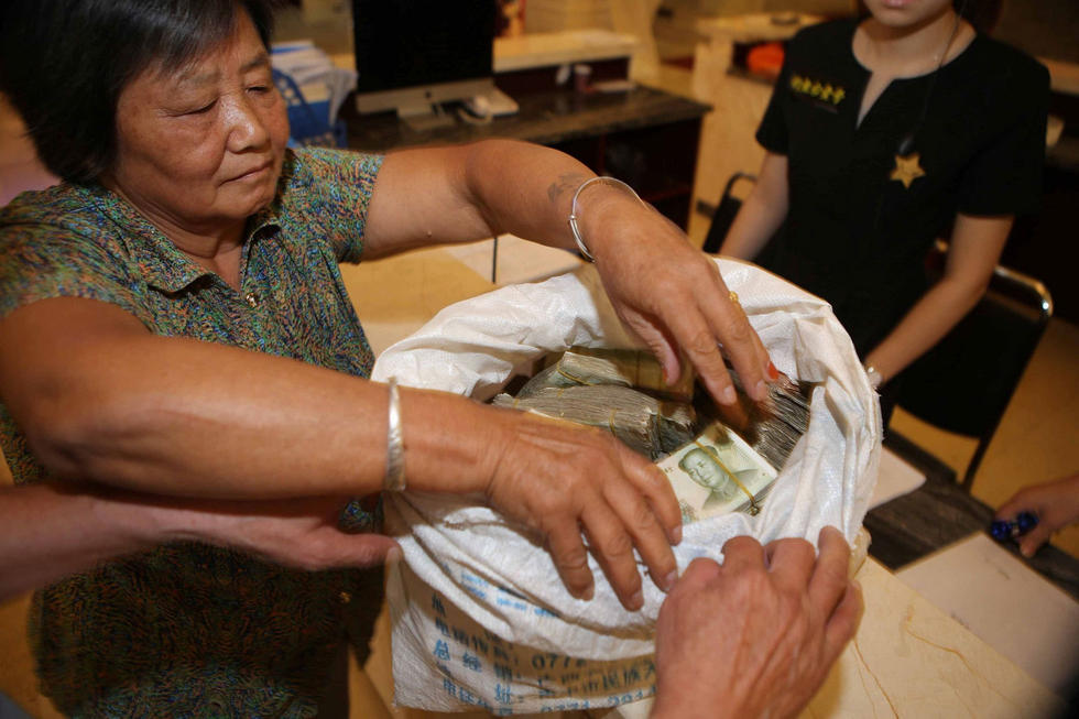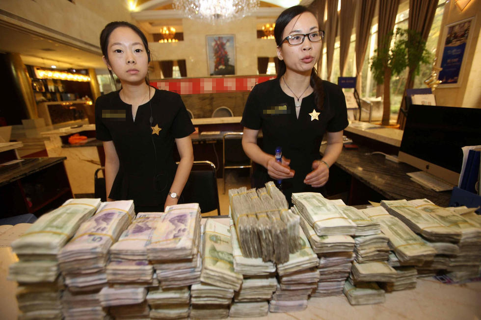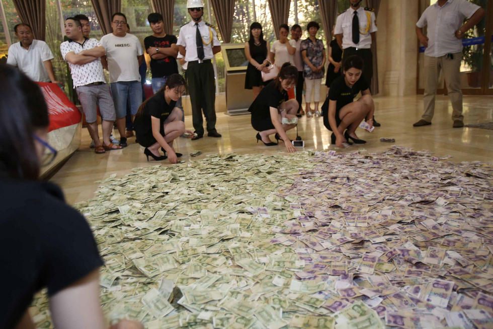 圖為售樓人員數(shù)錢(qián)現(xiàn)場(chǎng)。