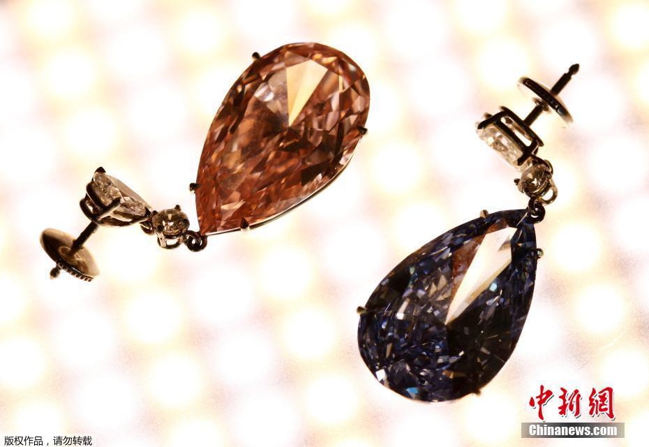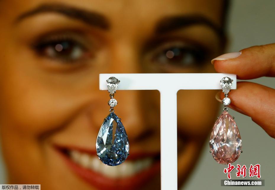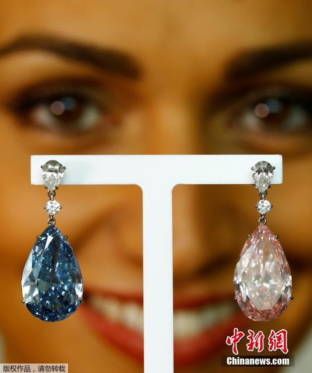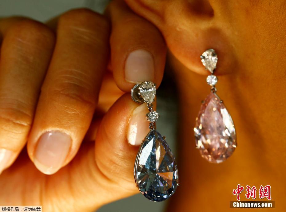 當(dāng)?shù)貢r(shí)間2017年5月11日,瑞士日內(nèi)瓦,14.54克拉的“阿波羅藍(lán)”和16克拉的“阿耳特彌斯粉”鉆石耳環(huán)即將在蘇富比拍賣行拍賣,估價(jià)分別為3800-5000萬(wàn)美元和1250-1800萬(wàn)美元。