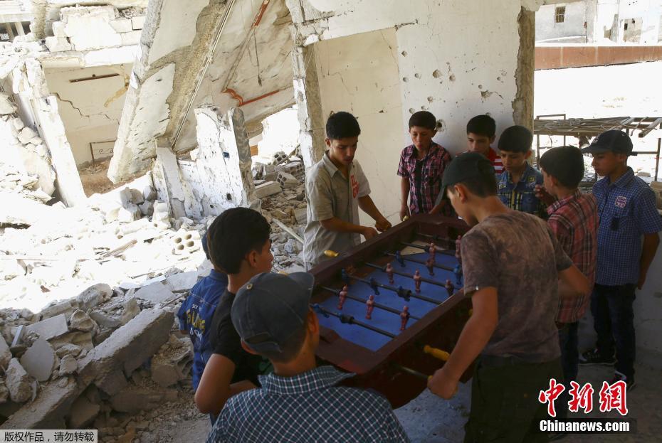 當(dāng)?shù)貢r(shí)間2017年6月26日,敘利亞反對(duì)派控制區(qū)杜馬,男孩在廢棄的建筑內(nèi)玩桌上足球慶祝開(kāi)齋節(jié)。