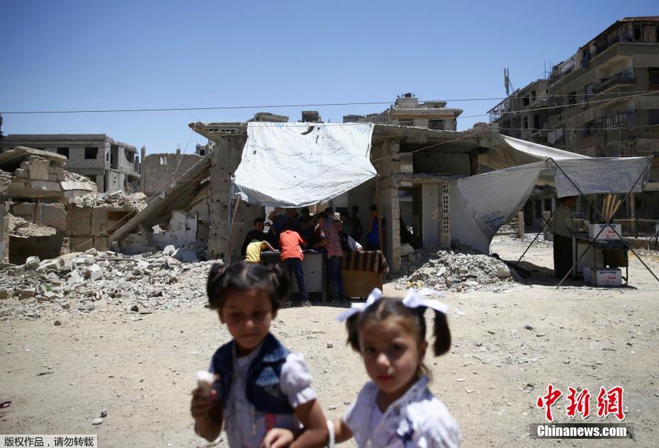 當(dāng)?shù)貢r(shí)間2017年6月26日,敘利亞反對(duì)派控制區(qū)杜馬,兒童在臨時(shí)的游樂(lè)園玩玩耍慶祝開(kāi)齋節(jié)。